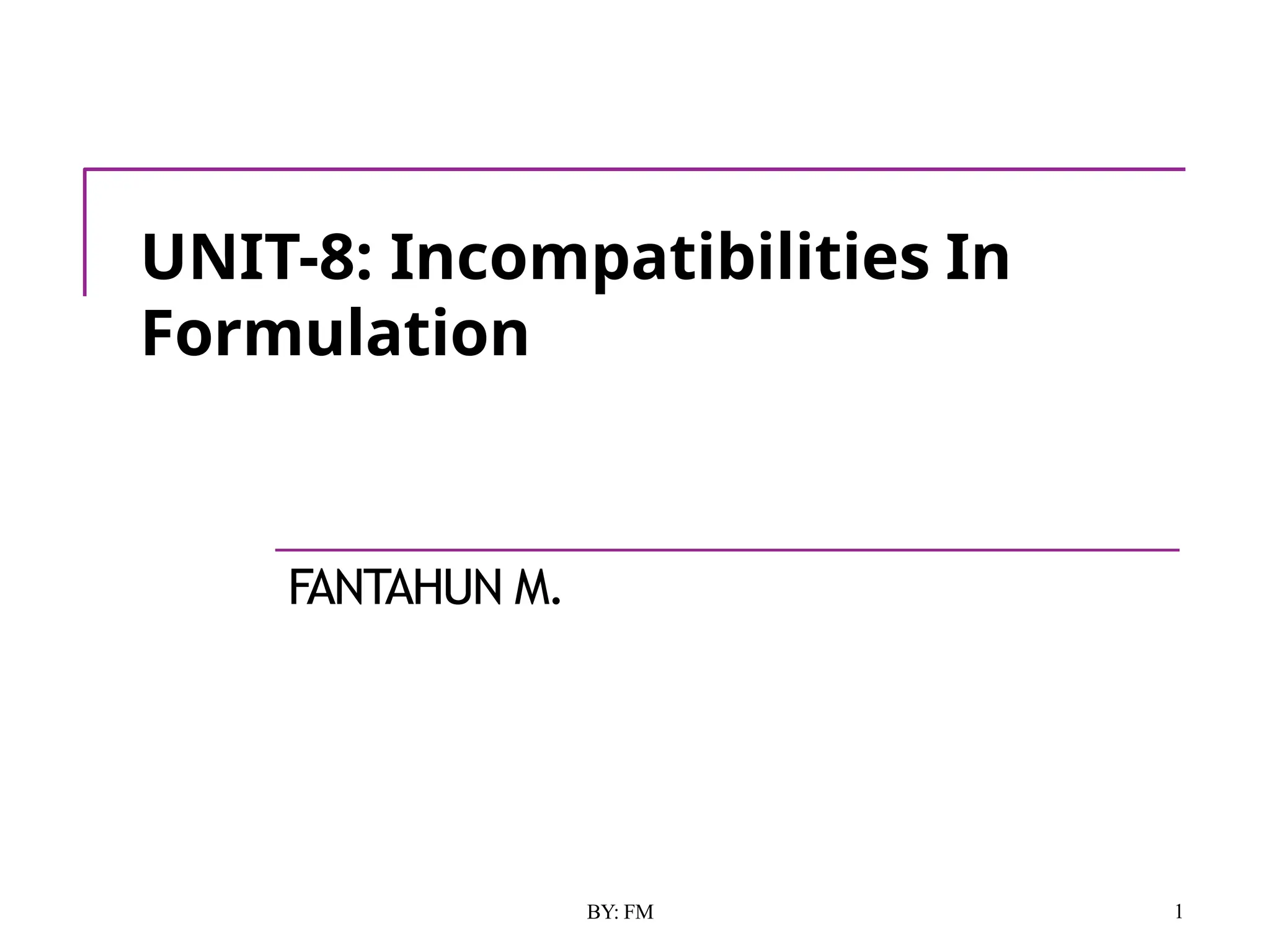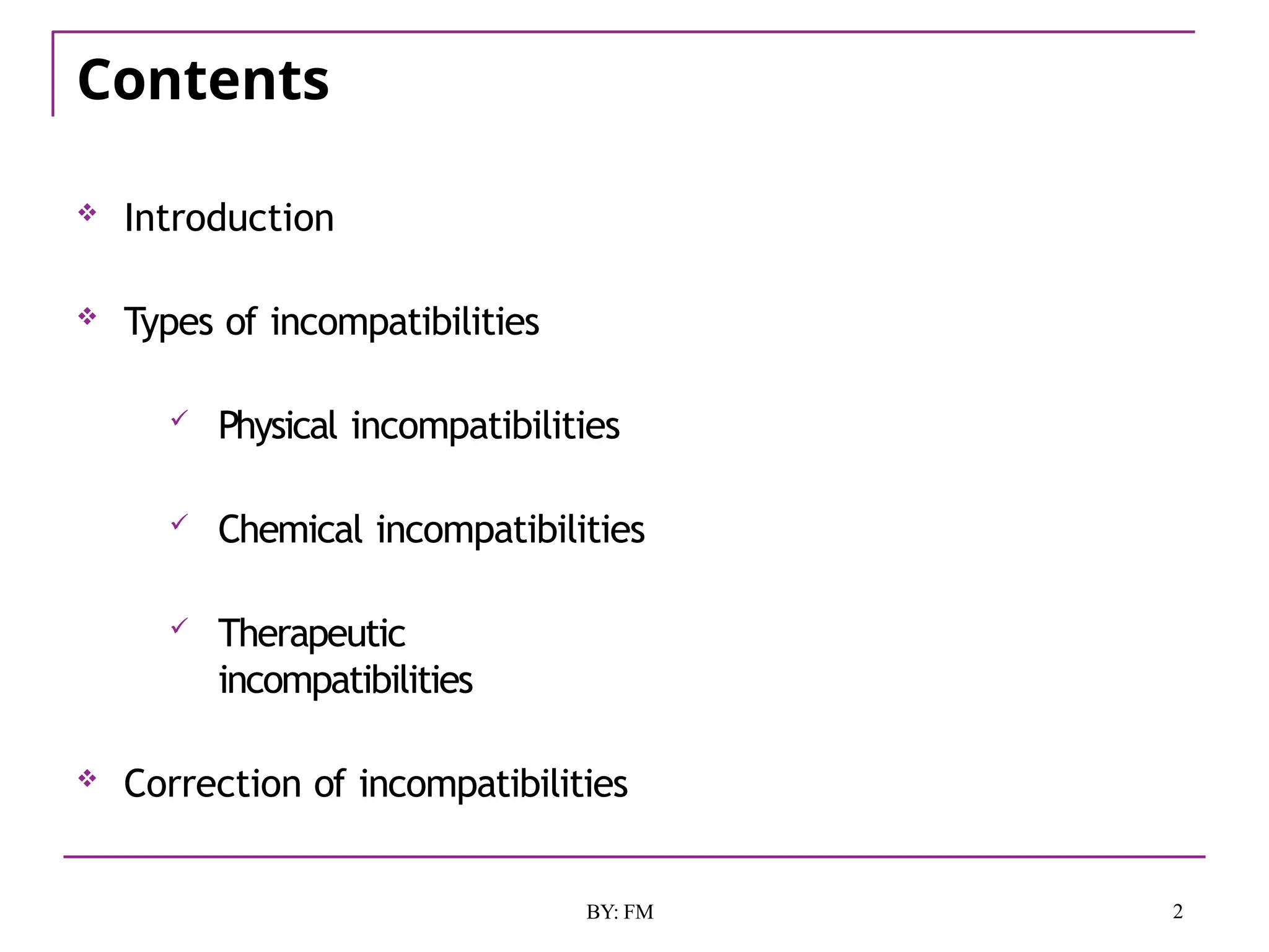 The document discusses the various types of incompatibilities in pharmaceutical formulations, including physical, chemical, and therapeutic incompatibilities. It explores definitions, manifestations, and correction methods for each type, providing examples and factors that lead to incompatibilities, such as changes in solubility and drug interactions. The importance of recognizing and correcting potential incompatibilities during drug formulation to ensure safety and efficacy is emphasized.
