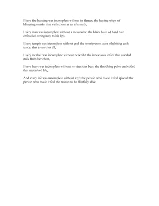 This document discusses how various natural and human elements are incomplete without certain defining features. It describes clouds as incomplete without rain, waves as incomplete without salt, flowers as incomplete without petals, birds as incomplete without wings, and many other similar comparisons between an element and the essential feature that gives it identity or purpose. The overall message is that love is what makes life feel complete and meaningful.