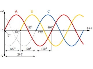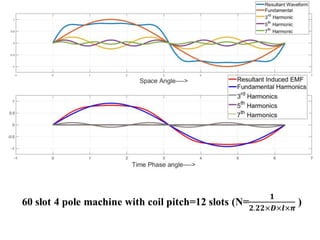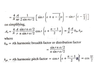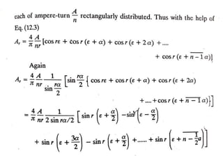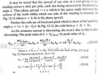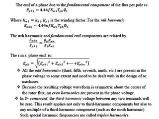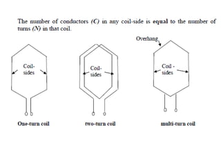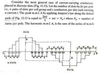 The document provides information on rotating electrical machines. It discusses the basic concepts of electromechanical energy conversion that occurs due to changes in flux linkages resulting from mechanical motion. It describes different types of machine windings including armature, field, AC, and distributed windings. The document also covers the generation of a rotating magnetic field in a three-phase system using three coils with currents that are equal in magnitude and phase-displaced by 120 degrees, resulting in a constant magnitude rotating magnetic field. It derives expressions for the induced voltages in coils and discusses factors that affect the induced voltages.