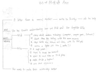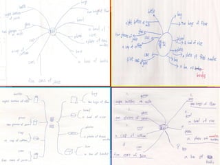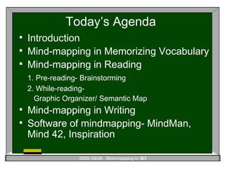 The document discusses integrating mind mapping into the English classroom. It covers using mind mapping for memorizing vocabulary, reading comprehension, and writing. For reading, mind maps can be used for pre-reading activities like brainstorming and while-reading activities like semantic maps or graphic organizers to organize information. Specific examples are given from the textbook "Joy" to illustrate how mind maps can be created for different units and chapters.