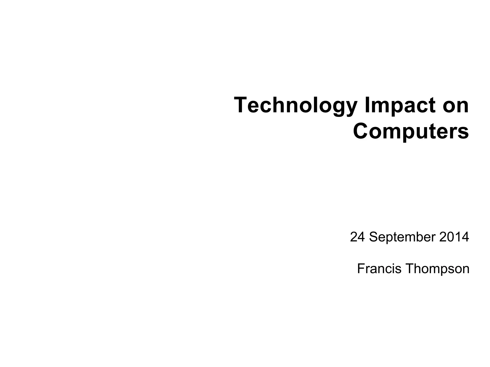 The document outlines the historical development of computer technology from 1978 to 2014, highlighting the evolution of personal computers, processor speeds, memory types, and storage technologies. It emphasizes the impact of solid-state drives (SSDs) on architecture, performance, and market trends, predicting a shift away from traditional hard drives. The conclusion suggests significant changes in software development, focusing on multi-core processing and the potential for real-time applications as technology advances.