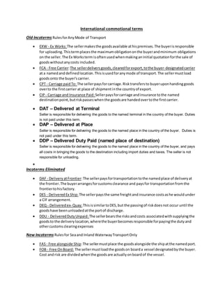 The document discusses International commercial terms (Incoterms) for specifying responsibilities of buyers and sellers for delivery, costs, and risk transfer in international trade. It outlines several Incoterms for any mode of transport including EXW, FCA, CPT, CIP, DAT, DAP, and DDP. It also lists Incoterms that have been eliminated such as DAF, DES, DEQ, and DDU. Finally, it introduces new Incoterms that apply only to sea and inland waterway transport including FAS, FOB, CFR, and CIF.