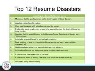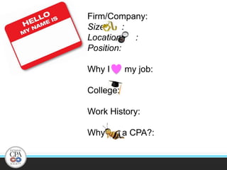 This document provides information about becoming a certified public accountant (CPA) including the requirements, career opportunities, and exam process. Some key points: - CPAs must have 150 credit hours of education, including 24 hours of accounting courses and 24 hours of business courses. They must pass the 4 section CPA exam. - There is flexibility and diverse career opportunities as a CPA such as working in any field like accounting, finance, consulting, or government. The unemployment rate for accountants is very low. - The CPA exam is changing with new computer-based testing, more task-based simulations, and inclusion of both US GAAP and IFRS questions. Exam sections are also