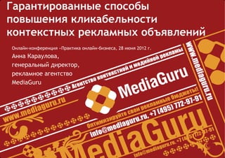 Документ представлен в виде материалов онлайн-конференции, посвященной стратегиям повышения кликабельности контекстной рекламы. Рассматриваются ключевые термины, методы геотаргетинга и принципы структурирования рекламных кампаний в системах Яндекс.Директ и Google AdWords. Упоминаются успешные примеры изменения текста объявлений и оптимизации показов, что ведет к повышению CTR и снижению стоимости кликов.