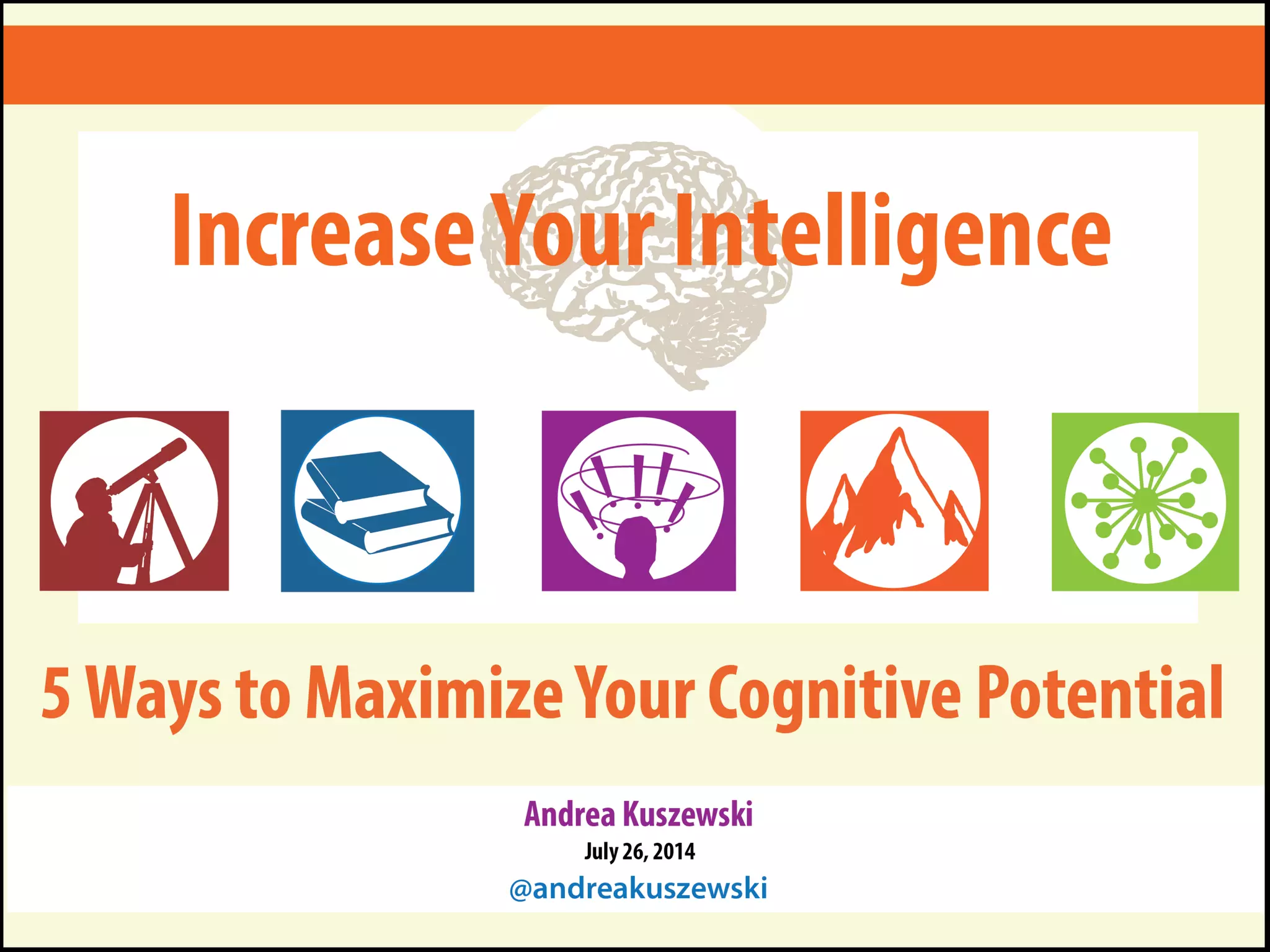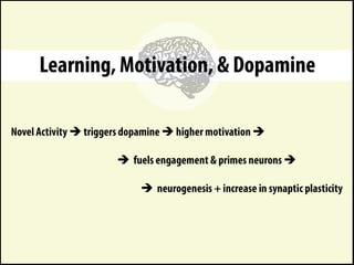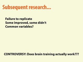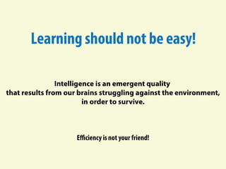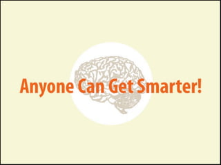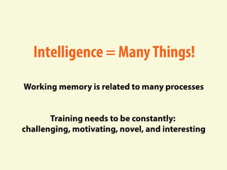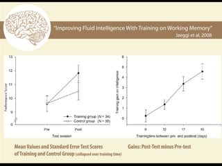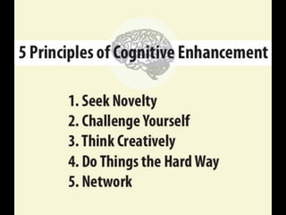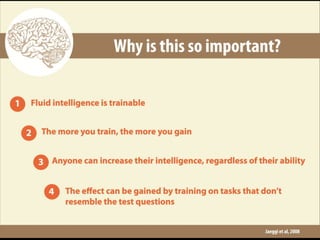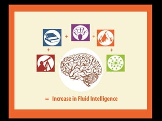 The document discusses developing one's fluid intelligence through motivation and challenging cognitive activities. It emphasizes constantly learning new skills and subjects, even after mastery, to engage both sides of the brain and strengthen creative and problem-solving abilities. Creative thinking is described as making remote connections between concepts by switching between conventional and unconventional thinking.