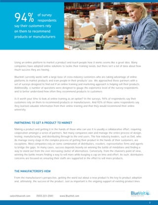 A survey conducted by BlueVolt shows that 94% of respondents believe their customers rely on them for product recommendations, and 92% find online training valuable, supporting increased sales. The document emphasizes how online training platforms provide flexible, self-directed learning opportunities that enhance product knowledge and enable staff to make informed recommendations at the point-of-sale. Overall, the findings suggest that companies adopting online training solutions can improve their marketing effectiveness and sales outcomes.