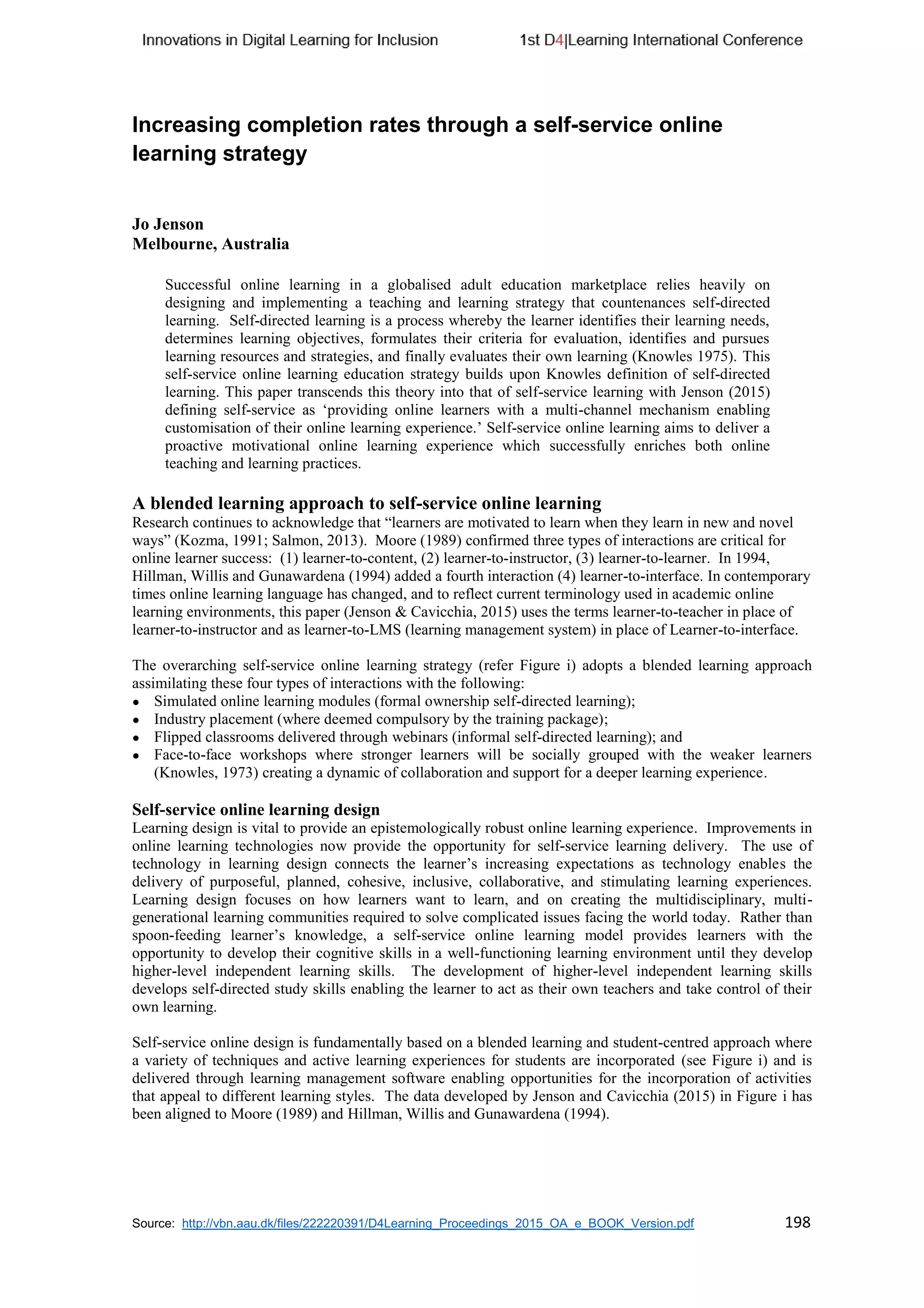 This document discusses a self-service online learning strategy to increase completion rates. It proposes a blended learning approach combining online modules, industry placements, webinars, and workshops. This self-service model aims to provide a proactive, motivational learning experience through customization and incorporating the four types of interactions identified as critical for online learner success: learner-to-content, learner-to-instructor, learner-to-learner, and learner-to-interface. The strategy is designed around a virtual learning environment using augmented reality to engage diverse learners and support self-directed learning across multiple learning styles.