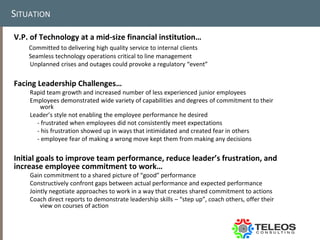 The document discusses a situation where a VP of Technology was facing challenges with a rapidly growing team of less experienced employees. His leadership style was intimidating and created fear in employees. The goals were to improve team performance, reduce the leader's frustration, and increase employee commitment. Actions taken included getting feedback on the leader's style, agreeing on goals and outcomes, and identifying key leadership behaviors to develop through coaching conversations. The results were improved team performance through open dialogue, increased ability to manage crises, the leader influencing at a broader level through coaching, and increased satisfaction for both the leader and employees.