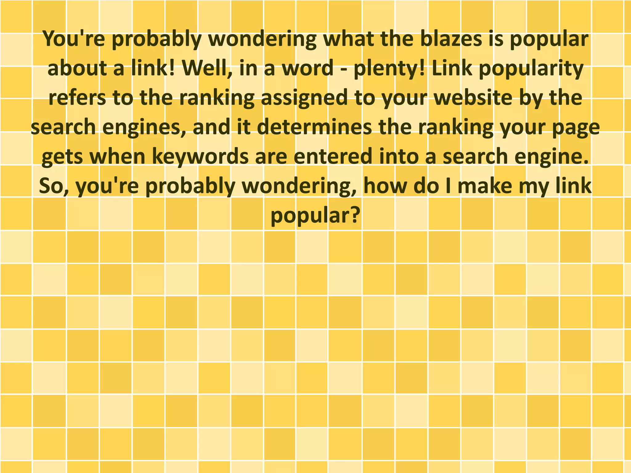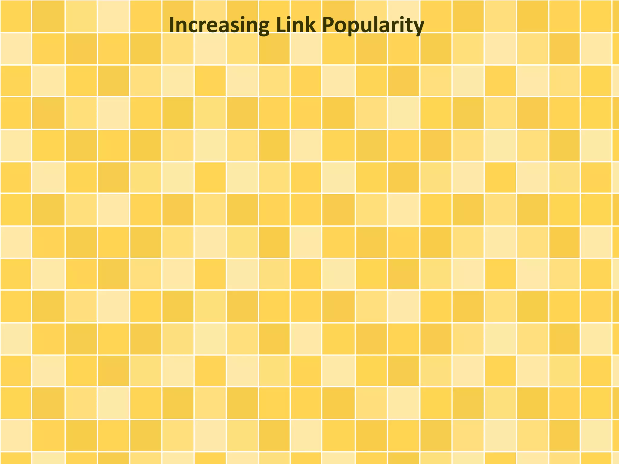 The document discusses how to increase link popularity in order to improve search engine rankings. It explains that search engines give higher rankings to websites that have links from other high-quality, relevant sites. It provides tips for getting listed on directories, finding sites to link to that are related and non-competitive, and politely contacting them to request a reciprocal link. Regularly checking search engine rankings and linked sites is recommended to monitor progress in improving link popularity over time through ongoing linking efforts.
