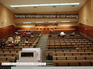 Abelardo Pardo presented on increasing student engagement through personalized feedback. He discussed how simple information transfer is not effective for learning and that active learning techniques that engage students are better. Personalized feedback was identified as one of the most effective ways to improve student outcomes. If designed well, with frequent, timely, and targeted feedback, engagement and achievement can be increased. Pardo concluded that embracing instructional design principles, understanding student approaches, and using data to provide personalized situated feedback can strongly benefit learning.