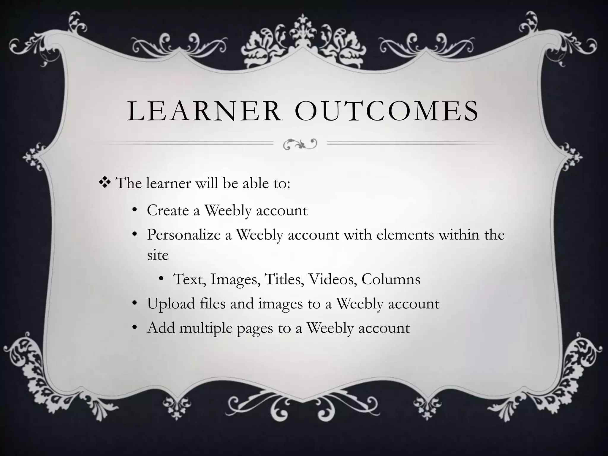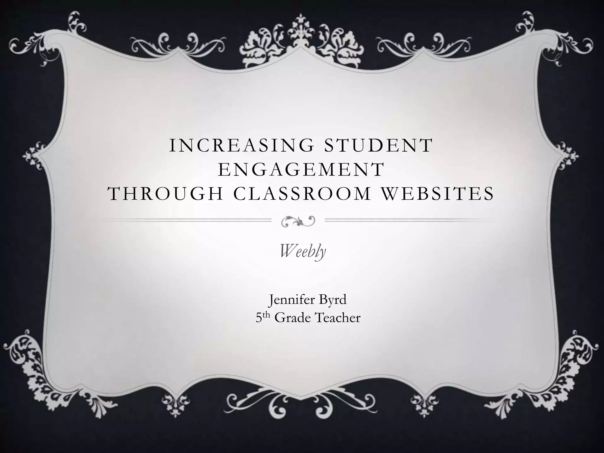 This document discusses using Weebly classroom websites to increase student engagement. It provides directions for teachers to create a free Weebly account, customize it with various elements like text, images, videos and columns, add multiple pages, and publish the site. The goals are to engage 21st century learners who seek technology and immediate feedback, while addressing ISTE standards for teachers and students.