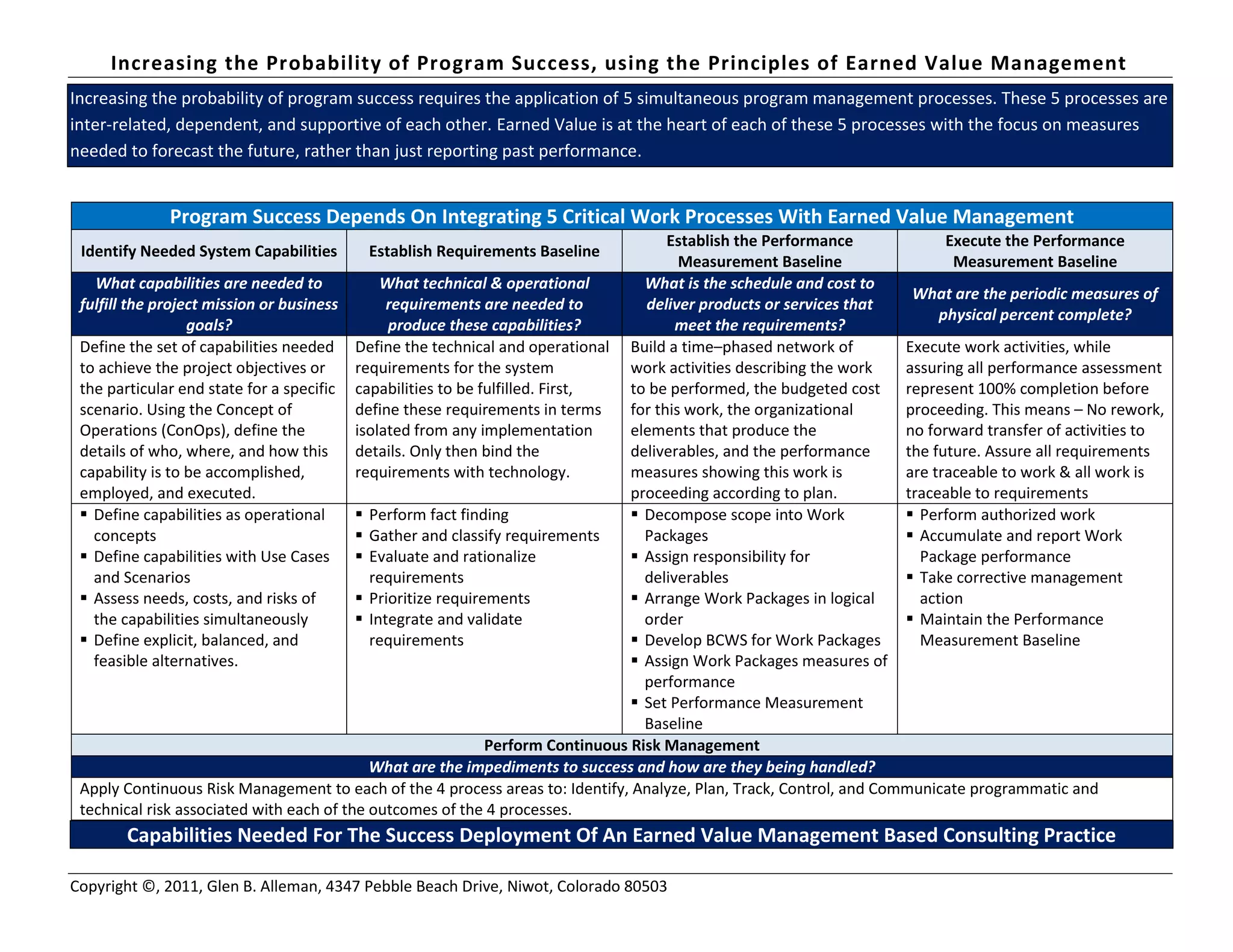 1) Integrating risk management, technical performance measures, and systems engineering processes with Earned Value Management is needed to increase the probability of program success.