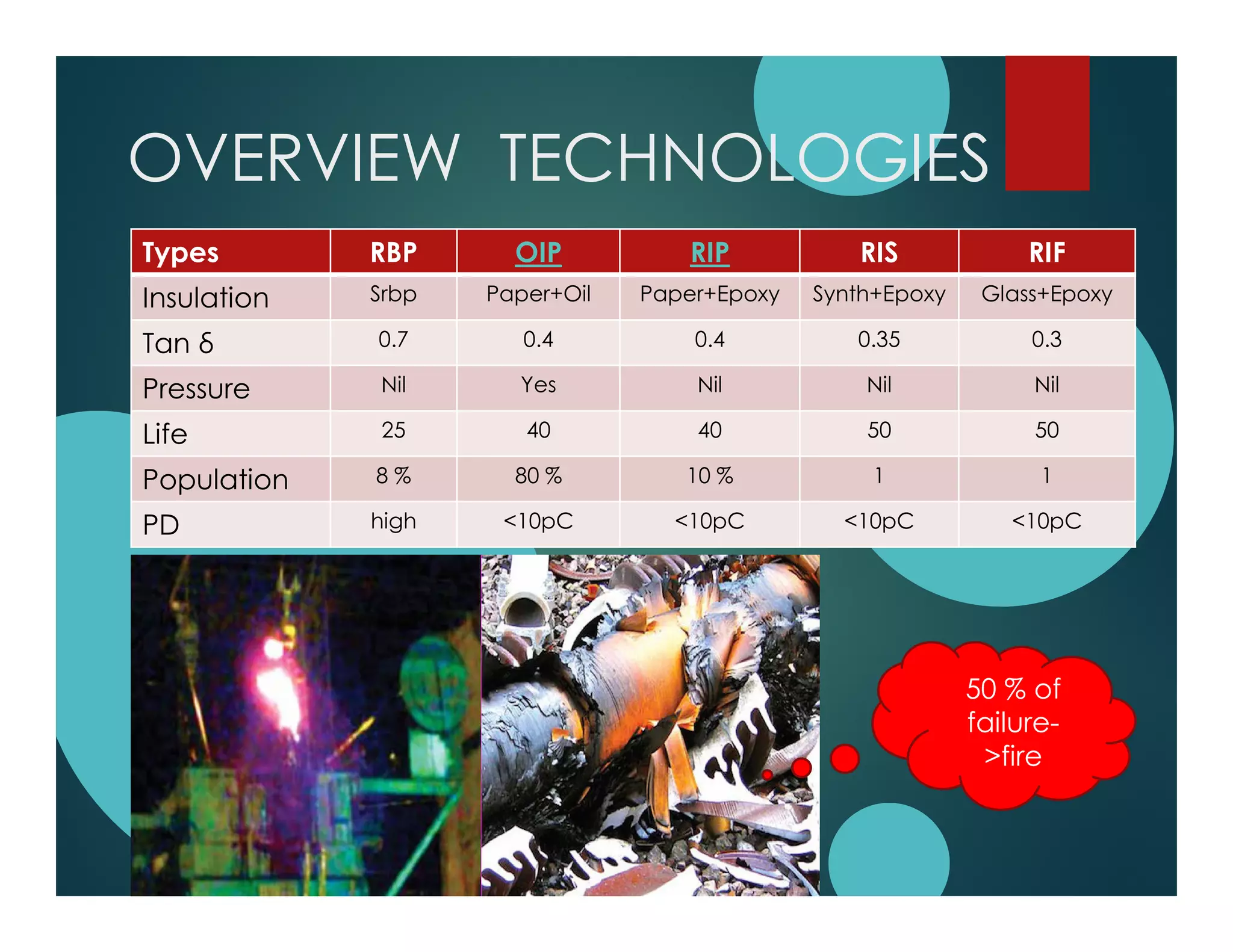 The document reviews various bushing technologies for transformers, focusing on improving reliability and safety through risk assessment and innovative materials. It discusses the advantages of resin impregnated paper (RIP) and highlights alternatives like fiberglass impregnated glass, offering greater resistance to mechanical and thermal stresses. The document outlines a step-by-step smart plan for replacing aging bushing fleets based on risk factors and technology types.