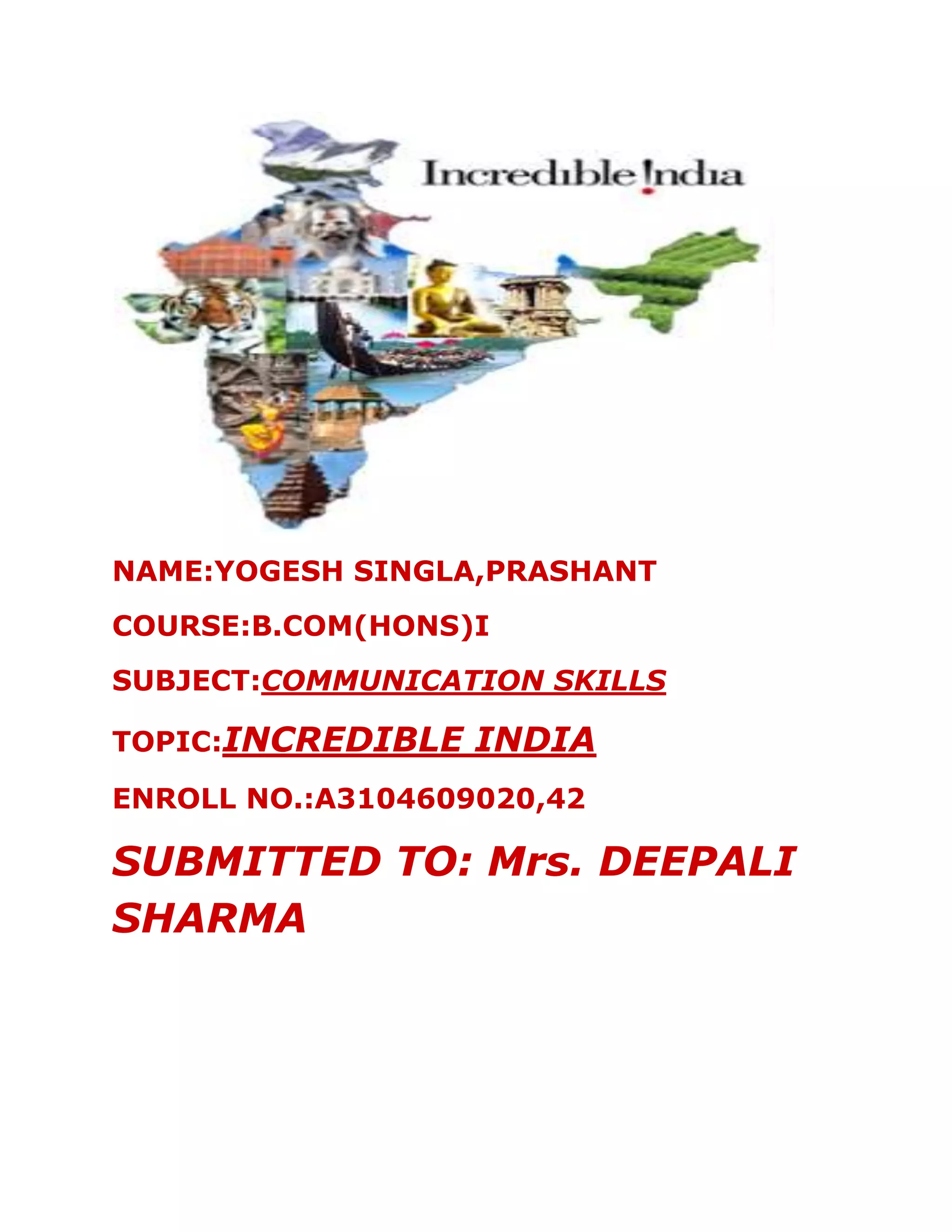 India is a land of enormous diversity from north to south and east to west. It has varied landscapes ranging from the Himalayan mountains to deserts. Each region has its own culture, languages, costumes, religions, art, music, and dances. India offers memorable experiences through its cultural heritage, hospitality, and variety of tourist attractions across its different states and regions. The cuisines also vary significantly across India and are known for their exotic gravies and use of aromatic spices.