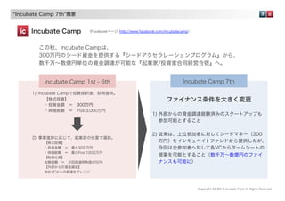 概要 Incubate Camp (Facebookページ: http://www.facebook.com/incubatecamp) この秋、Incubate Campは、 300万円のシード資金を提供する『シードアクセラレーションプログラム』から、 数千万∼数億円単位の資金調達が可能な『起業家/投資家合同経営合宿』へ。 Incubate Camp 1st - 6th Incubate Camp 7th 1) Incubate Campで投資採択後、即時提供。 【株式投資】 ・投資金額 = 300万円 ・時価総額 = Post3,000万円 2) 事業進 に応じて、起業家の任意で選択。 【株式投資】 ・投資金額 = 最大30百万円 ・時価総額 = 最大Post100百万円 【転換社債】 転換価額 = 次回調達時株価の50% 【外部からの資金調達】 他社VCからの調達をアレンジ ファイナンス条件を大きく変更 1) 外部からの資金調達経験済みのスタートアップも 参加可能とすること 2) 従来は、上位参加者に対してシードマネー(300 万円)をインキュベイトファンドから提供したが、 今回は全参加者へ対して各VCからタームシートの 提案を可能とすること(数千万∼数億円のファイ ナンスも可能に) Copyright (C) 2014 Incubate Fund All Rights Reserved.