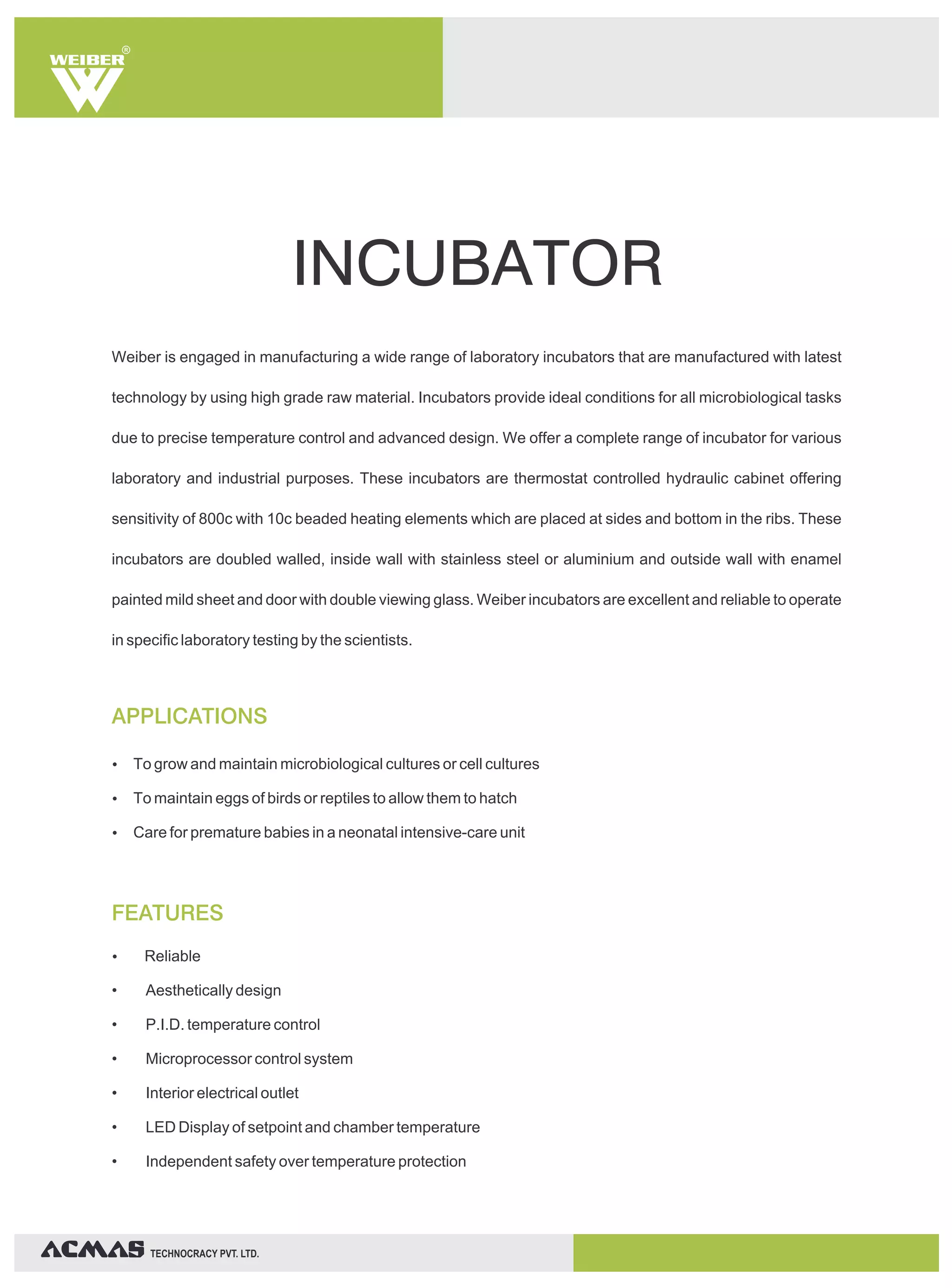 Weiber manufactures a wide range of laboratory incubators for microbiological tasks, industrial processes, and medical applications. The incubators precisely control temperature and humidity to provide ideal growth conditions. Weiber offers incubators for bacteria and cell cultures, hybridization, shaking, eggs, low temperatures, and more. The incubators use advanced technology and materials to maintain accurate, uniform conditions for scientific experiments and industrial processes.