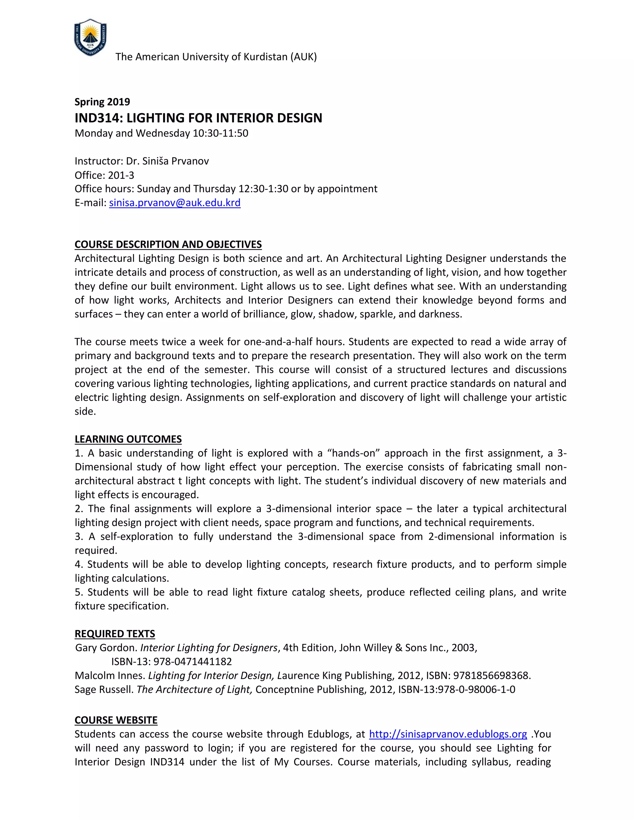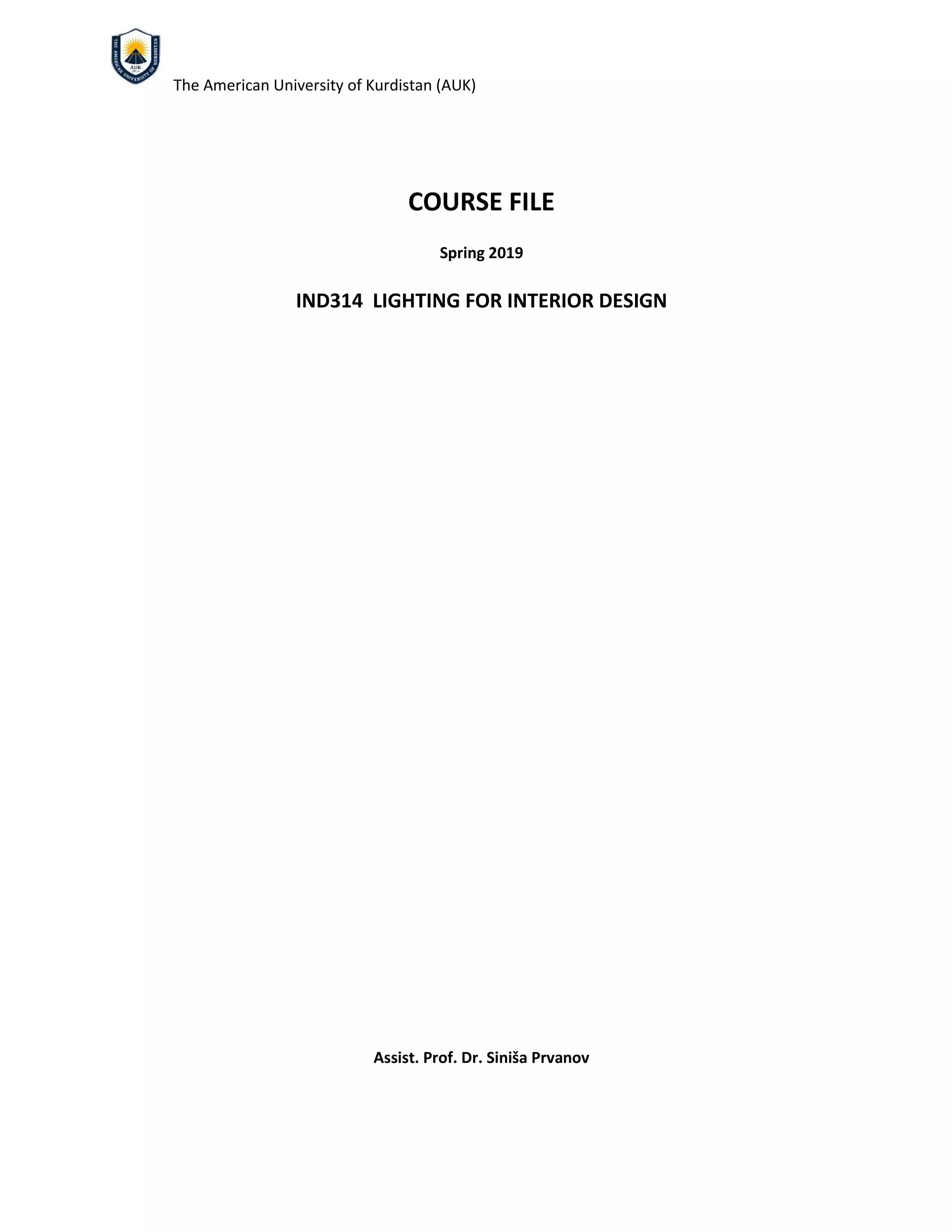 The document provides a detailed course overview for IND314: Lighting for Interior Design at the American University of Kurdistan for Spring 2019, led by Dr. Siniša Prvanov. It outlines course objectives, learning outcomes, grading policies, attendance requirements, and schedules for assignments and presentations, while emphasizing the importance of understanding light in architectural design. Students will engage in both theoretical studies and practical assignments, including research presentations and a term project, alongside expected reading materials.