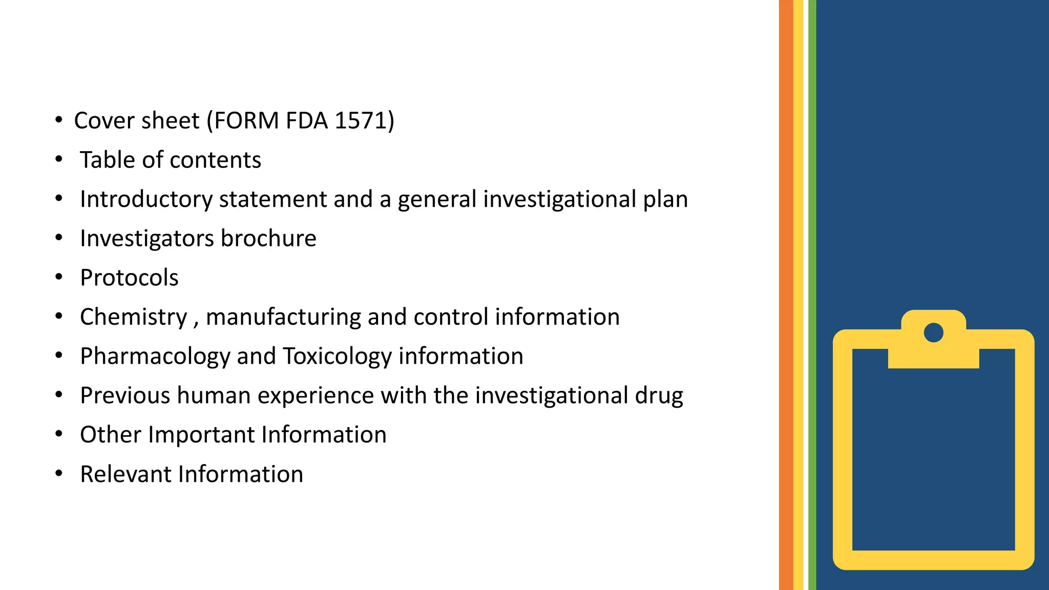 The document outlines the content and format requirements for submitting an Investigational New Drug (IND) application to the FDA, including necessary components such as the cover sheet, investigational plan, and safety information. It emphasizes the importance of a signed FDA Form 1571 and the correct formatting for application numbers, along with detailed information about the investigational drug's chemistry, pharmacology, protocol, and prior human experience. Additional considerations include information on drug dependence, abuse potential, and the use of devices in conjunction with the IND.