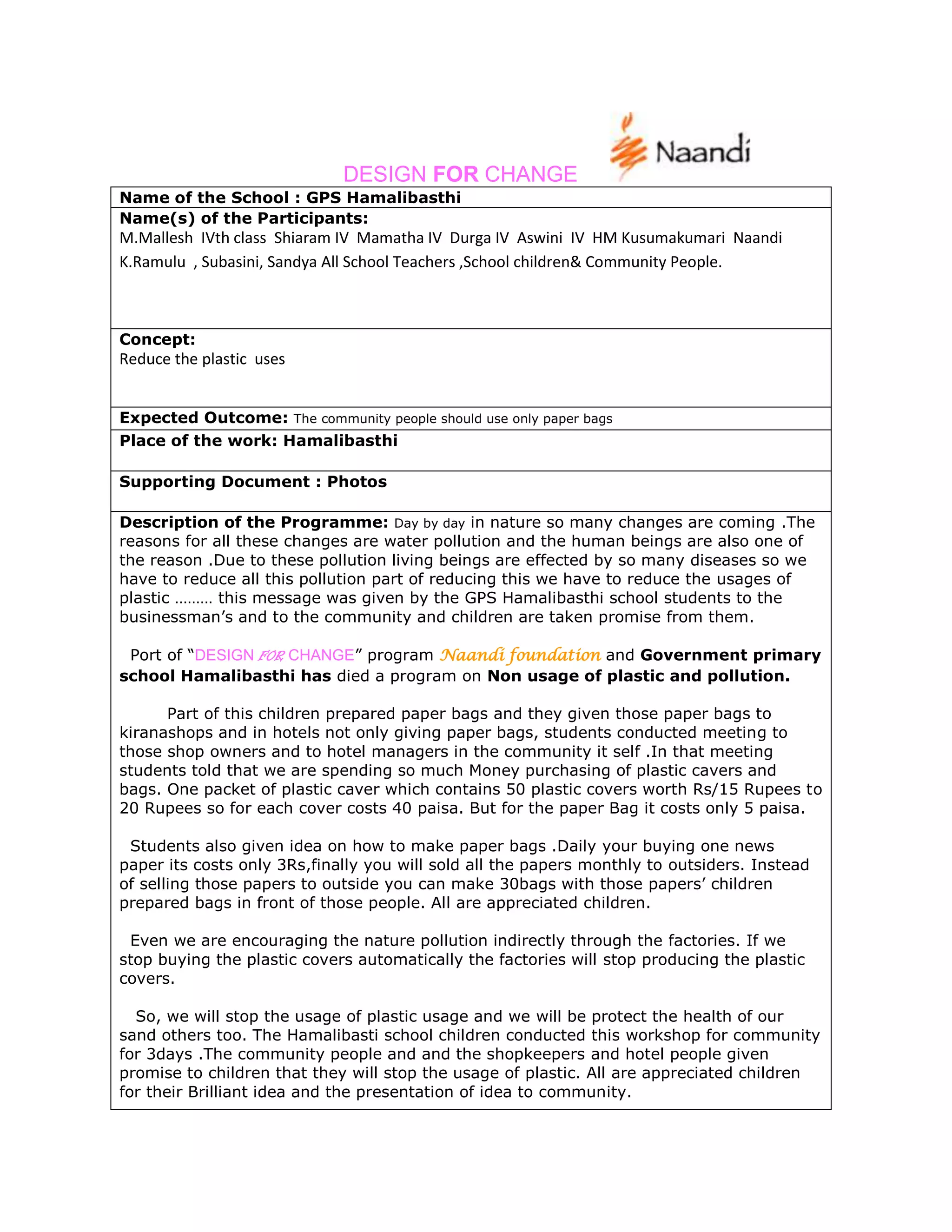Students at GPS Hamalibasthi school in India organized a program to reduce plastic usage in their community. They explained to local shop owners and community members how plastic is polluting the environment and harming health. The students made paper bags as an alternative and demonstrated how to make them cheaply using discarded newspaper. Both shop owners and community members agreed to stop using plastic and switch to paper bags after being convinced by the students' presentation. As a result, plastic usage has been greatly reduced as the community now exclusively uses paper bags.