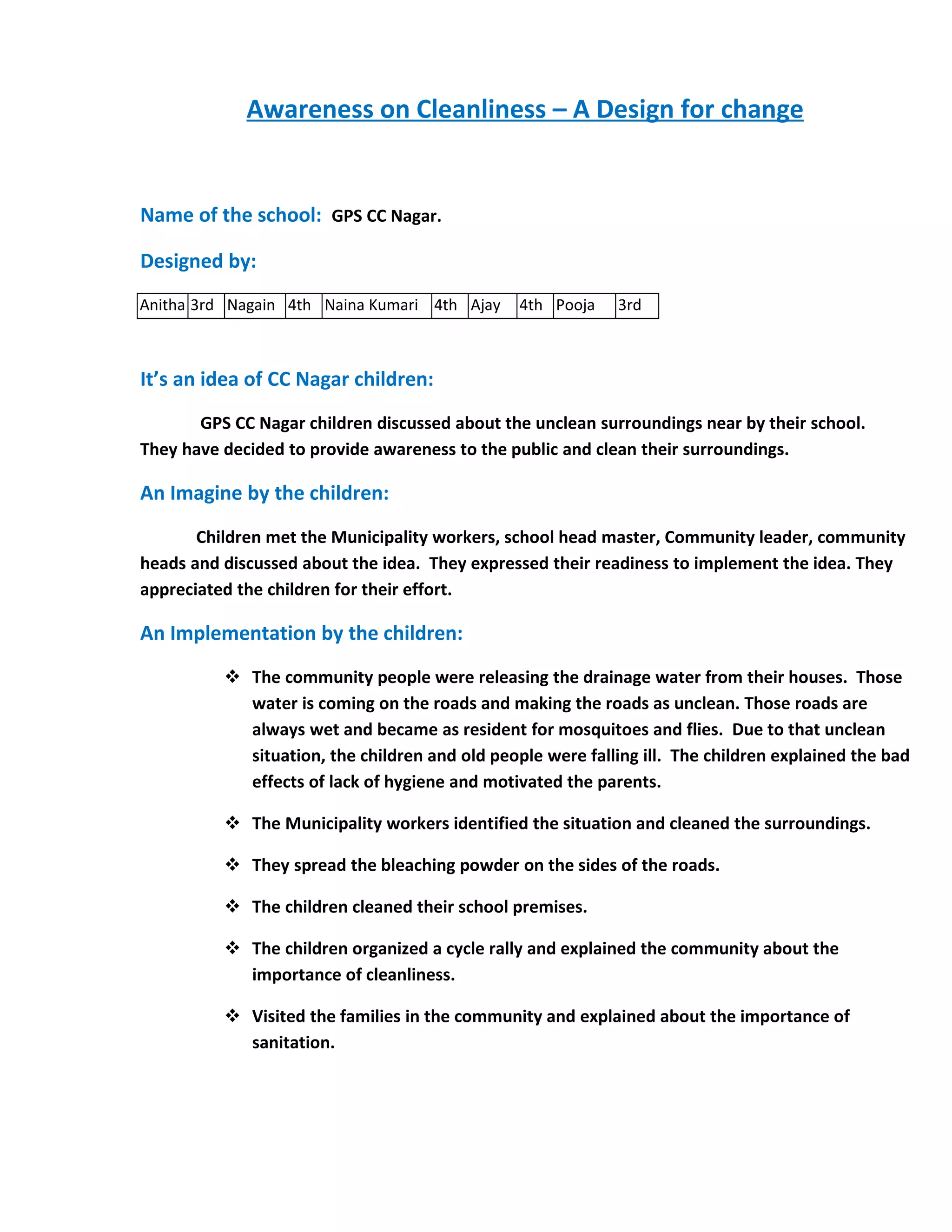 The document describes a project by children at GPS CC Nagar school to raise awareness about cleanliness in their community. They discussed unsanitary conditions near the school with local leaders and workers. The children then motivated residents to stop draining wastewater onto roads, helped workers clean the area, and organized a cycle rally to educate others about hygiene. Their efforts were aimed at improving sanitation and preventing illness.