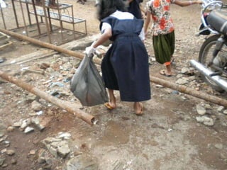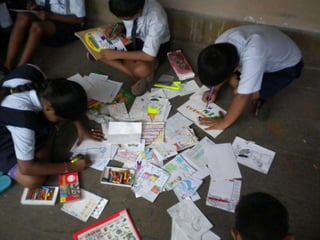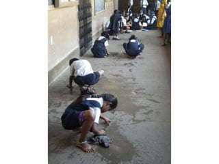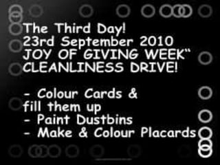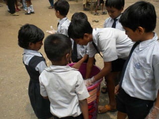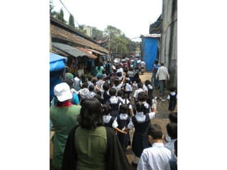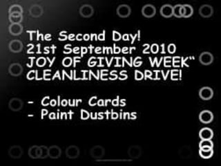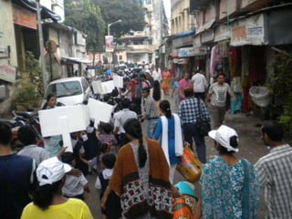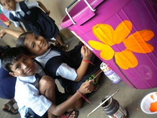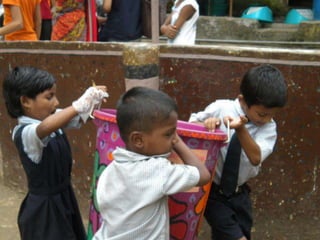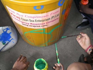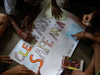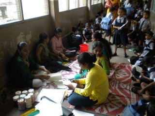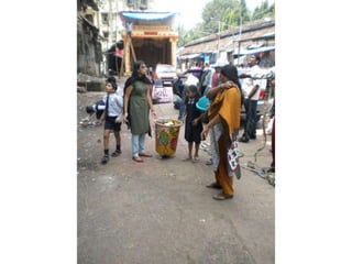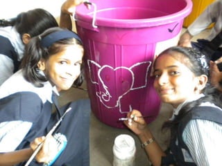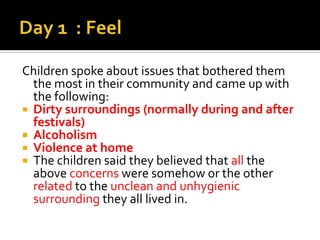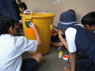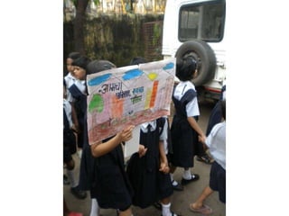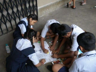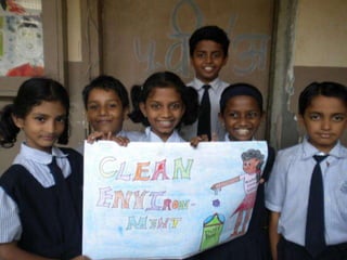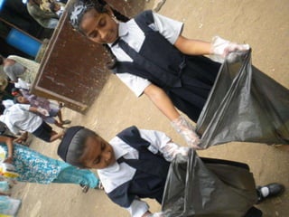 Children at a Mumbai school organized a week-long cleanliness drive in their community in response to issues like dirty surroundings, alcoholism, and violence. Over the course of 6 days, the students brainstormed issues, planned activities like making posters and cards, and donated dustbins. They spoke with community members about cleanliness and led marches with chants. On the final day of action, the students participated in cleaning their surroundings. They learned the importance of cleanliness and expressed wanting to continue the drive in future years.