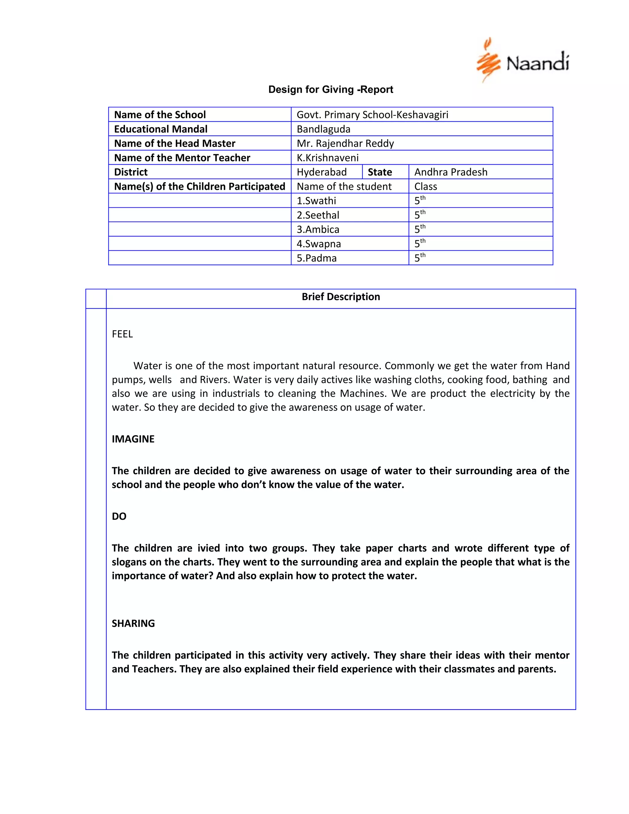 This document summarizes a design for giving project conducted by students at the Govt. Primary School-Keshavagiri. Five students from class 5 participated in the project to raise awareness about water conservation in their local community. The students were divided into two groups, created slogans on charts about the importance of water, and went door-to-door in the surrounding area to explain the value of water and how to protect it. The children actively participated and shared what they learned with their teachers, classmates, and parents.