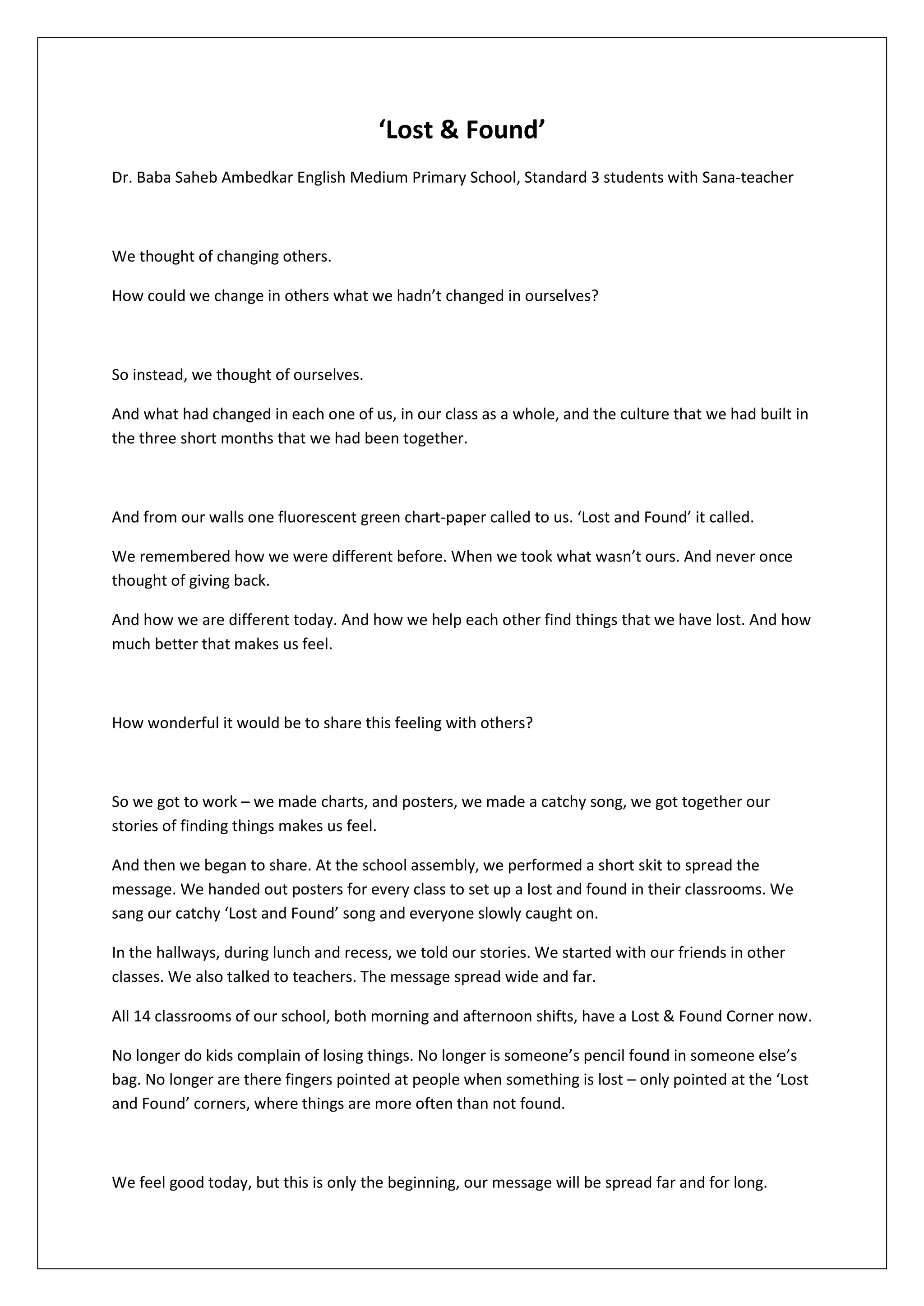The students at Dr. Baba Saheb Ambedkar English Medium Primary School created a "Lost & Found" program to address issues around stealing and help students find lost items. They made posters and songs to spread the message of the Lost & Found corners to their entire school. As a result, students now return lost items to the Lost & Found corners instead of taking things that aren't theirs or accusing others when something is missing. The program was a success, reducing complaints about lost items and spreading the message beyond their classroom.