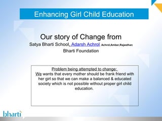 This document summarizes the efforts of Satya Bharti School in Adarsh Achrol, Rajasthan to promote girl child education in their community. The school organized activities to raise awareness among parents about the importance of educating girls. This included dramas, posters, and door-to-door conversations. As a result, parents pledged to support their daughters' education. Moving forward, the school aims to ensure all girls in the community can access education over the next 3 months.