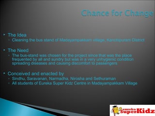 Five students from the Eureka Super Kidz Centre conceived a plan to clean the bus stand in Madayampakkam village, as it was in an unhygienic condition causing discomfort. They coordinated with local people and received approval from the Village Panchayat Head. With the help of tutors and locals, they removed thorny bushes, covered mud puddles and pot holes, and added plants and flowers, transforming the bus stand into a neater area. The children were proud of their accomplishment and grateful for the appreciation of village people.