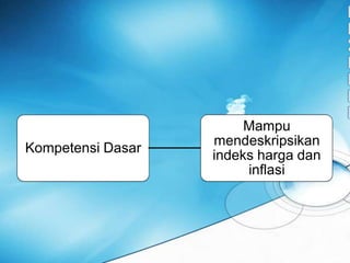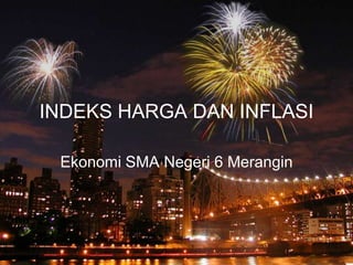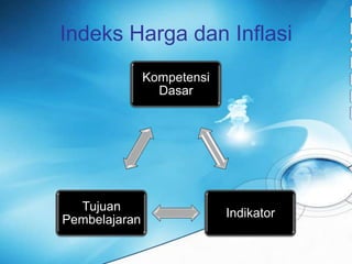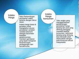 Dokumen ini membahas mengenai indeks harga dan inflasi, termasuk definisi, jenis, penyebab, dan cara mengatasi inflasi. Ia juga menjelaskan bagaimana menghitung tingkat inflasi menggunakan indeks harga konsumen dan memberikan contoh perhitungan. Inflasi antara tahun 2004 dan 2005 dihitung menunjukkan peningkatan harga sebesar 8%.