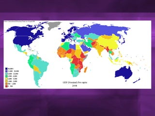 This document discusses different ways to measure the development gap between wealthy and poor countries. It begins by introducing the "Brandt line" from 1981, which showed that the global North possessed 80% of the world's wealth while the South had only 20%. However, this simple division is outdated as some countries have developed faster than others. The document then examines common economic indicators like GDP and GNI, as well as the Human Development Index (HDI), which provides a more holistic picture of health, education, and living standards. While measures provide useful comparisons, development has been uneven globally, and some regions like Sub-Saharan Africa still lag far behind in growth.