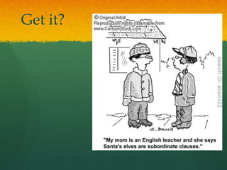 The document defines and provides examples of clauses, phrases, and sentences. It explains that a clause contains both a subject and a verb, while a phrase does not. An independent clause conveys a complete thought on its own, while a subordinate clause does not. Examples are given of independent and subordinate clauses as well as phrases. Readers are then asked to identify groups of words as sentences, clauses, or phrases. The document concludes by explaining how subordinate clauses must be combined with independent clauses to form complete sentences.