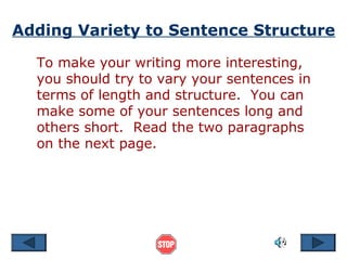 The document discusses varying sentence structure by using simple, compound, and complex sentences and provides examples of each. It explains that simple sentences contain one independent clause, compound sentences contain two independent clauses joined by a semicolon, coordinating conjunction, or transition, and complex sentences contain one independent clause and one dependent clause joined by a subordinating conjunction. The document aims to teach readers how to effectively vary their sentence structure for more interesting writing.