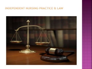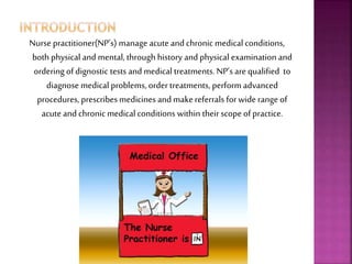 This document provides information about nurse practitioners (NPs) and independent nurse practice (INP). It defines NPs as registered nurses who have graduate-level nursing education and can diagnose, treat, and prescribe medications within their scope of practice. INPs are registered nurses who provide healthcare services independently. The document discusses the history and development of the NP role in the US since the 1960s. It also outlines the education, certification, and scope of practice of NPs in different specialties. Challenges to the NP and INP roles are mentioned, as well as strategies to address them through legislation, guidelines, and adherence to professional and legal standards.