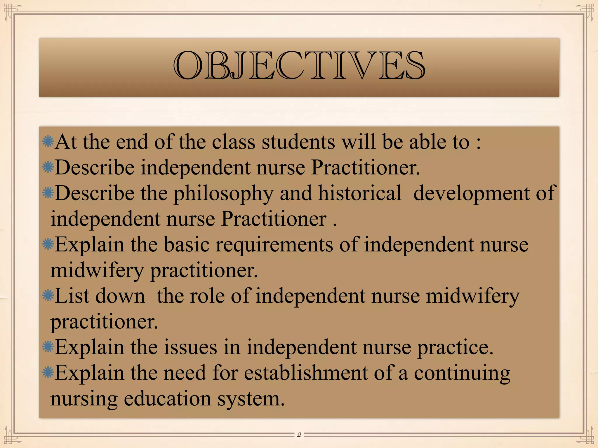The document discusses independent nurse practitioners, specifically independent nurse midwifery practitioners. It defines independent nurse practitioners as advanced practice nurses with a master's degree who are licensed to practice independently. It outlines the philosophy, historical development, standards, key practices, and issues of independent midwifery practice. It also discusses the development of independent nurse practitioners in India to address shortages and reduce maternal and infant mortality rates.