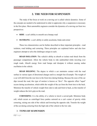Independent suspension allows each wheel on the same axle to move vertically independently of the other. It is common for modern vehicles to have independent front suspension (IFS) and some to have independent rear suspension (IRS) as well. Independent suspension offers better ride quality and handling due to lower unsprung weight and each wheel's ability to react individually to the road. Some common independent suspension system types are MacPherson strut, double wishbone, and multi-link systems.