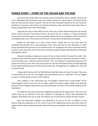 The document tells two intertwined stories: the rise and fall of General Pang, represented as a panda, who faces betrayal, loss, and disgrace during a war and ultimately transforms into a symbol of peace and patience due to his tragic past. The second story describes the transformation of crows, once friendly companions of humans, into vengeful creatures as a result of betrayal by both humans and eagles. Both narratives explore themes of loss, regret, and the enduring impact of past actions on present behavior.