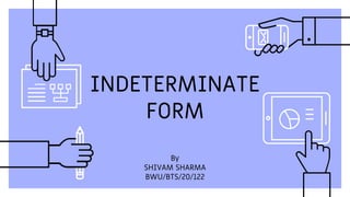 The document discusses indeterminate forms in calculus, which arise when evaluating limits that do not provide sufficient information to determine the original limit. It outlines seven types of indeterminate forms and explains l'Hôpital's rule, a method to evaluate limits of the forms 0/0 and ∞/∞. Additionally, the document provides examples of applying these concepts to solve specific limit problems.