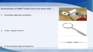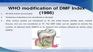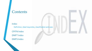 The document provides information on various oral health indices, including the CPITN (Community Periodontal Index of Treatment Needs), DMFT (Decayed Missing Filled Teeth), and DMFS (Decayed Missing Filled Surface) indices.