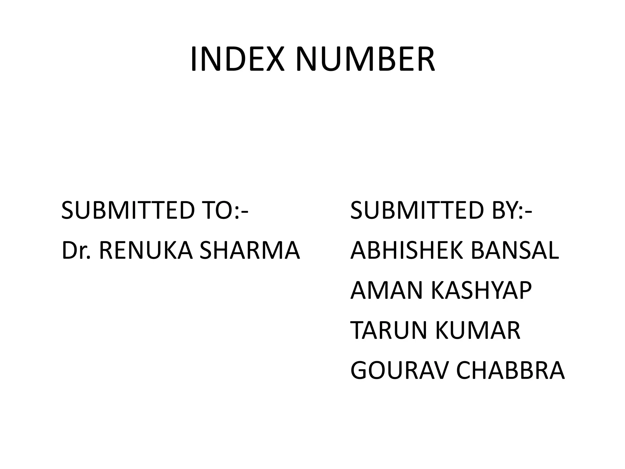 1) Index numbers measure relative changes in variables like prices, quantities, or values over time by calculating the ratio of current to base values.