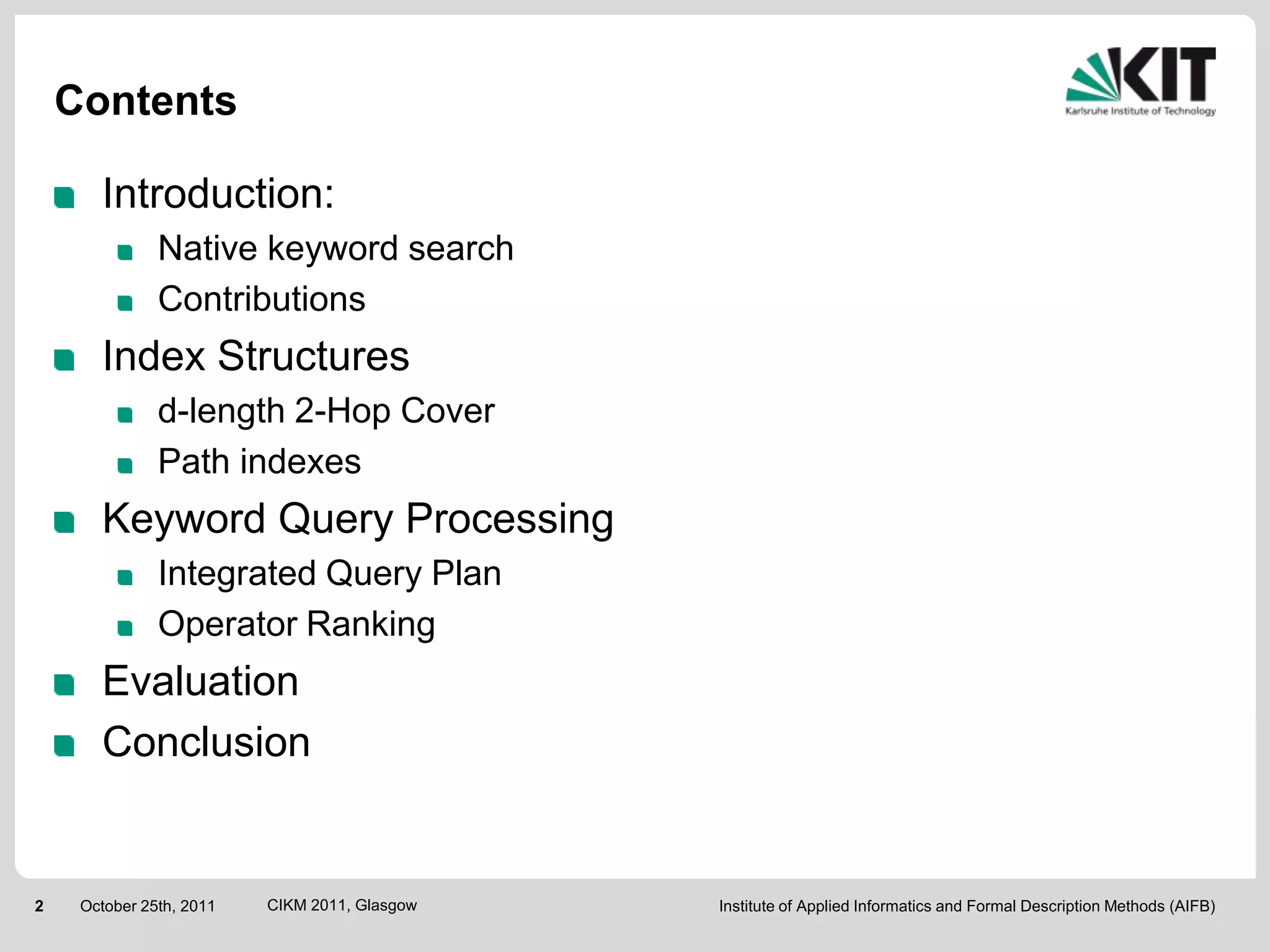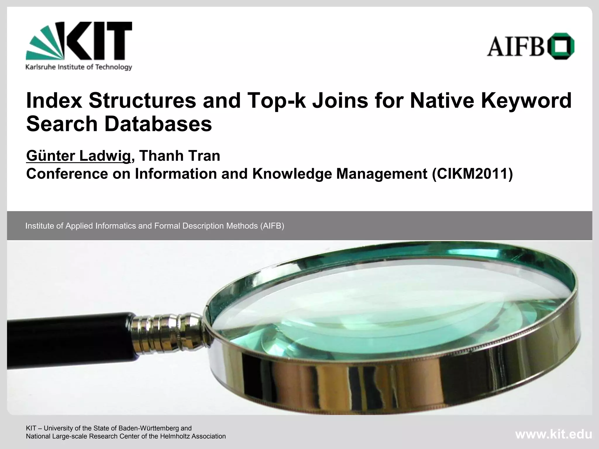 The document describes an approach for performing native keyword search over graph-structured data using database operations. It proposes indexing the data at the path level using a d-length 2-hop cover to efficiently access neighborhoods. It transforms the keyword search problem into a series of top-k join operators over the indexed paths. An integrated query plan is used to share operators between different join orders. Operator ranking is applied to the join processing to iteratively produce results.