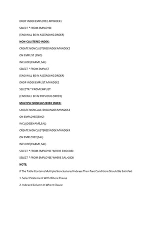 The document discusses indexes in SQL Server and their types. It explains that indexes are used to improve the speed of retrieving data from tables by ordering the records. The main types are clustered and non-clustered indexes. A clustered index physically reorders the table based on the indexed column, while a non-clustered index logically orders rows without changing the physical order. The document provides syntax examples for creating, dropping, and using different index types on tables.