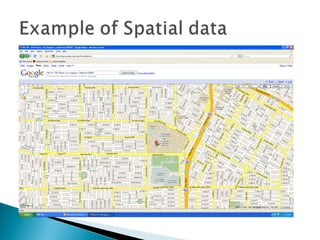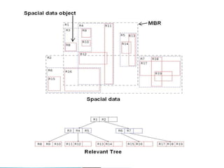 The document discusses R-trees, a data structure used to index multi-dimensional spatial data. R-trees allow for efficient searching of spatial data by grouping data into minimum bounding rectangles (MBRs) and storing them in a tree structure based on these envelopes. The tree structure resembles a B+-tree, with internal nodes containing pointers to child nodes or data records. R-trees provide efficient search, insertion, and deletion of spatial data objects through operations on the tree structure and splitting or merging of nodes as needed.