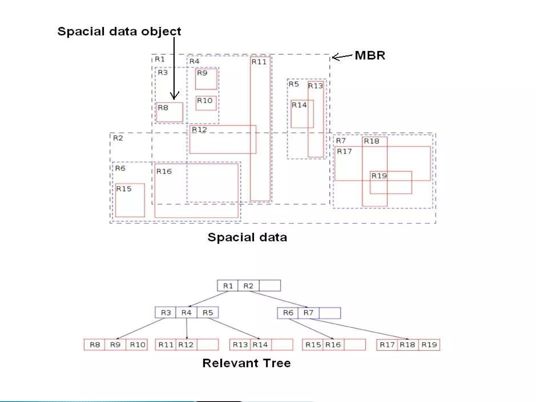 The document discusses R-trees, a data structure used to index multi-dimensional spatial data. R-trees allow for efficient searching of spatial data by grouping data into minimum bounding rectangles (MBRs) and storing them in a tree structure based on these envelopes. The tree structure resembles a B+-tree, with internal nodes containing pointers to child nodes or data records. R-trees provide efficient search, insertion, and deletion of spatial data objects through operations on the tree structure and splitting or merging of nodes as needed.