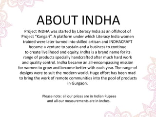 Project INDHA was started by Literacy India to provide job training and create businesses to generate livelihood for women. Indha became a brand that produces handcrafted products to modern designs. The goal is to bring products made by remote communities to markets in Gurgaon. The document appears to be a catalog listing various utility bags and accessories available for purchase that were handcrafted through Project INDHA, including details on materials, sizes, minimum order quantities and prices in Indian rupees. Contact information is provided at the end for placing orders.