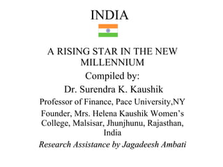 India has a long and diverse cultural history dating back 5000 years to the Indus Valley Civilization. Its culture has been influenced by invasions and trade with other regions. Music and festivals play an important role in Indian culture. Music styles range from folk to classical forms with various instruments. Major festivals celebrate religious events and seasons, such as Diwali which signifies renewal and is known as the "festival of lights". India has a variety of art, architecture, dance, and theater traditions reflecting its cultural diversity.