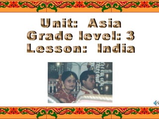 This document provides information and materials for a lesson on India. The lesson objectives are to locate India on a map, identify its flag, explain why the Taj Mahal was built, compare Indian and American customs, identify animals native to India, and express oneself through Indian art. The materials listed include food ingredients, art supplies, maps, information sheets, recipes, and books for further reading. The document outlines activities such as locating India on a map, discussing its geography and exports/imports, learning about Indian customs and holidays, playing Indian games, and creating Indian art.