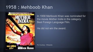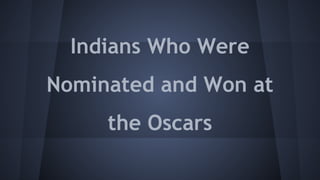 This document lists Indians who have been nominated for and won Academy Awards (Oscars) between 1958 and 2011. It notes that Bhanu Athaiya was the first Indian to win an Oscar in 1983 for Best Costume Design for Gandhi. Resul Pookutty and A.R. Rahman have also won Oscars - Resul Pookutty for Best Sound Mixing for Slumdog Millionaire in 2009, and A.R. Rahman for two awards for Slumdog Millionaire in 2009 including Best Original Score. Many other Indians have been nominated but not won awards.