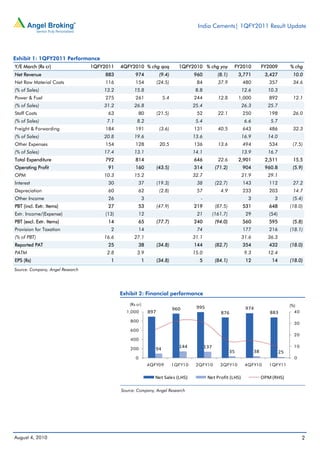 India Cements' net sales and profits declined significantly in the first quarter of fiscal year 2011 compared to the same period last year. Net sales decreased 8.1% and operating profit declined 71.2% due to a substantial decline in cement prices in Andhra Pradesh, which accounts for around 45% of the company's revenues. Net profit dropped 82.7% to Rs25cr as a result of the poor operating performance, despite a profit from selling shares in another company. The company expects pricing pressure to continue in the southern region in the coming quarters due to excess capacity.