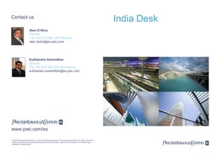 This document summarizes contact information for two representatives of PricewaterhouseCoopers' India Desk in Spain. It then provides brief statistics about Spain, noting that Spain has a population of 45.8 million, GDP of $1,622 billion, and is the 8th largest economy in the world. It also highlights that Spain offers access to over 1.2 billion potential customers in Europe, the Middle East and Africa and is a gateway to Latin America for business.